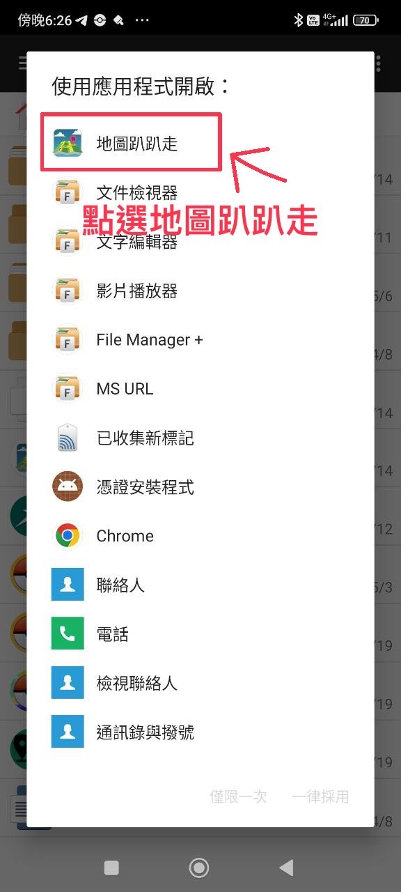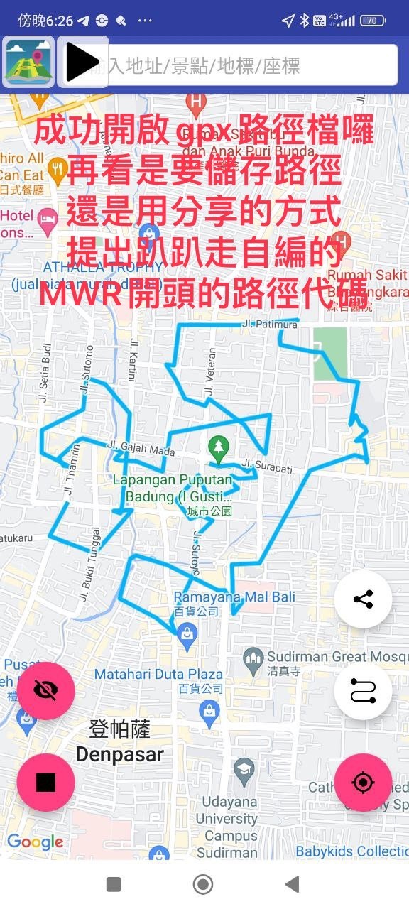 ⭕️因地圖趴趴走本身MainFace沒有定義可以接受gpx副檔名的檔案,所以必須藉助其他APP,例如File Manager+檔案管理工具開啟通用版gpx路徑檔,並藉以儲存最愛路徑或轉換成WMR開頭的路徑代碼供分享使用。